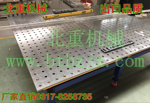 北重機械制造柔性焊接平臺的承載能力高,鋼性穩定,它的五個面均加工有規則的孔,并刻有網線。焊接平臺可方便地延伸和擴展,組合。